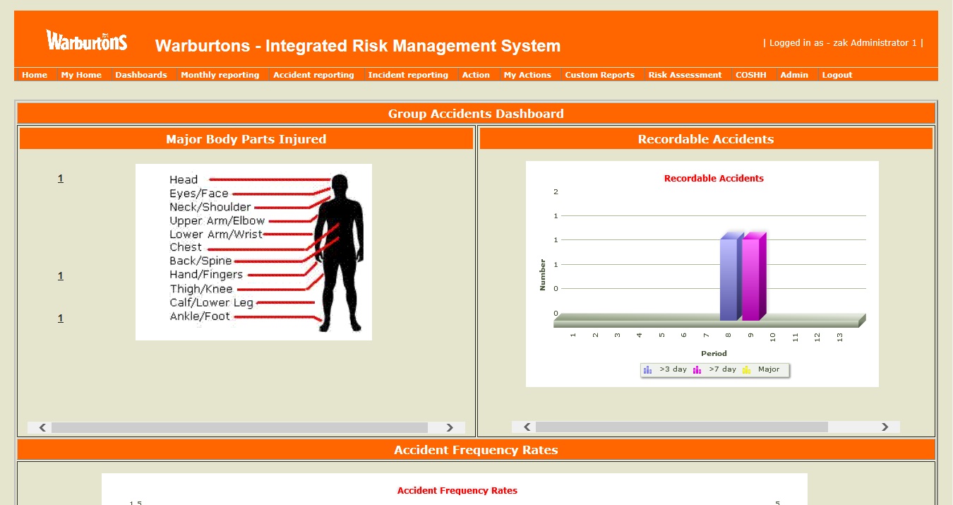 Customisable dashboards provide instant access to safety incident, action and risk metrics showing real-time data and analysis. Filter dashboards by site. Open Actions; Major Body Parts injured; Lost Time Accidents; Incidents; Accident Frequency Rates.