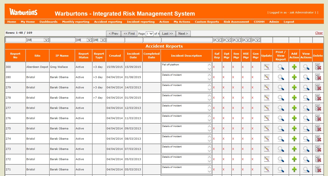 Query Accidents/Incidents/Near Miss and Envoronment reports. Filter by region, site, date, type of accident, status owner etc. Add / view and update related Actions
