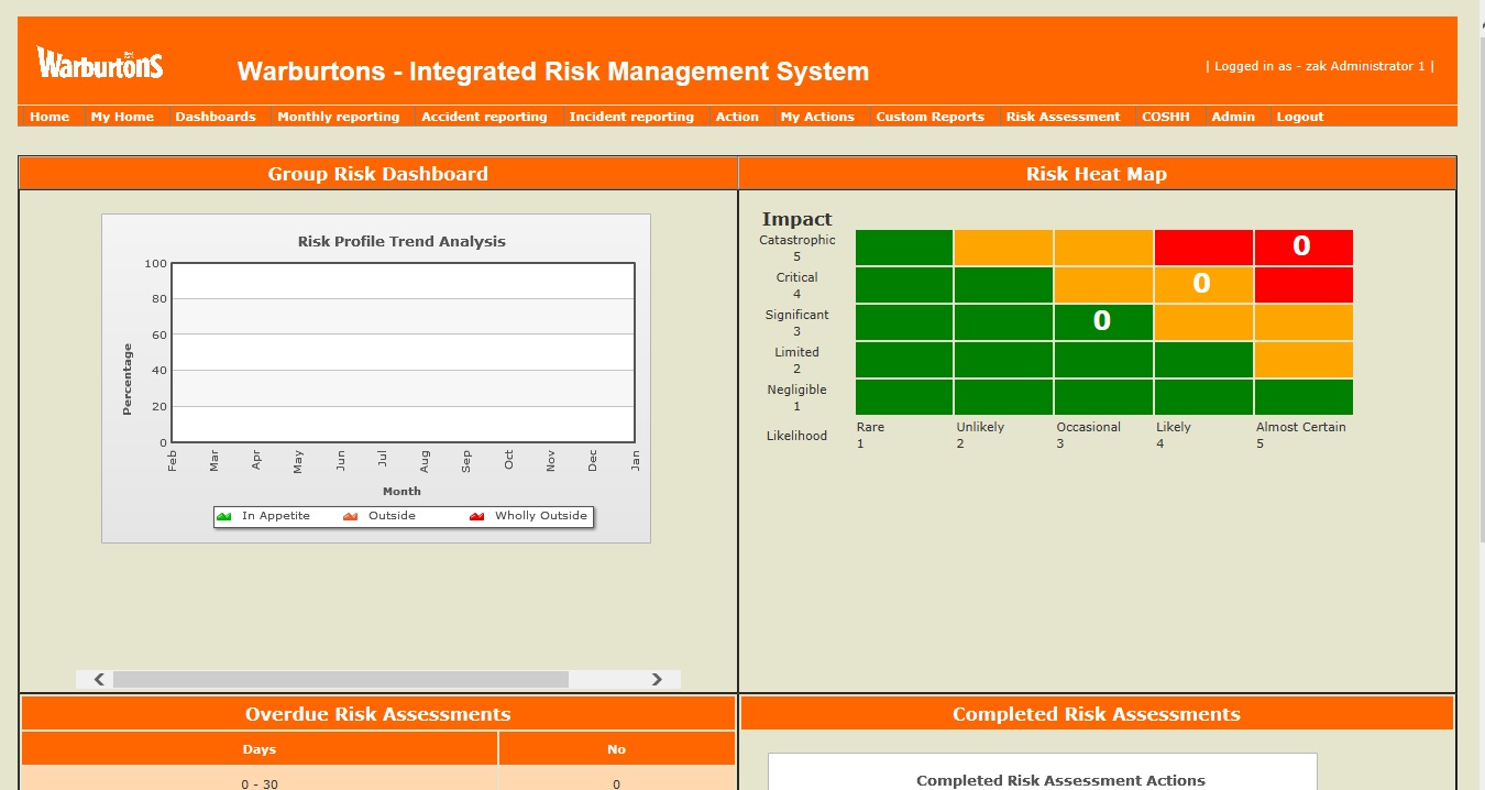 Risk dashboard detailing risk trend analysis, risk heat map, overdue assessments and completed assessments by month.