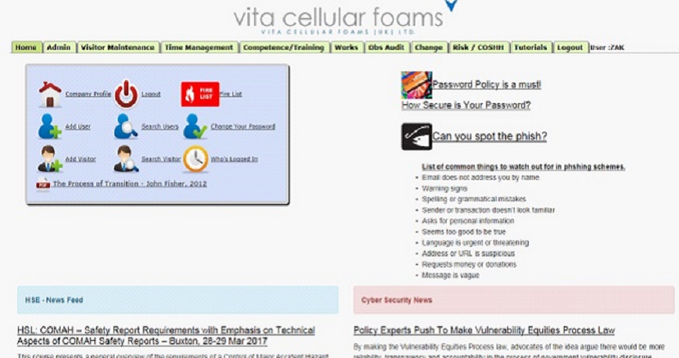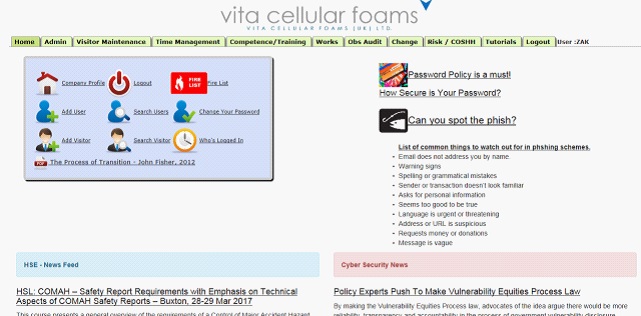 A customised home page with updatable news feeds on HSE and Cyber Security, links to safety documentation and video links.